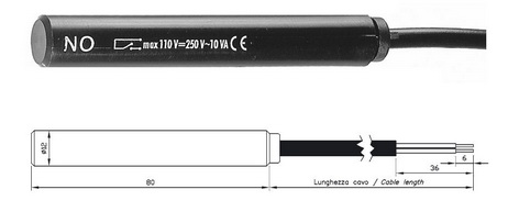 fekete max. 100VDC / 150VAC max. 10VA, max. 0,5A d=12 mm, hossz.: 80 mm